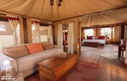 14 spacious tents have rustic and colorful African touches, offering all the comforts; including a private plunge pool on the deck, hot and cold running water, electricity (and complimentary herbal shower and bath products.)