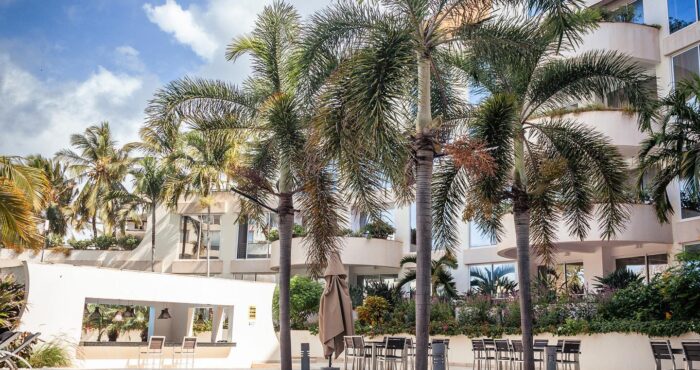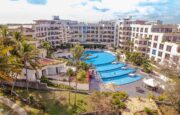 Private beaches stretch along the property, giving guests space to relax or explore the coastline. The resort features a sleek cluster of vacation apartments, each designed with comfort and function in mind.