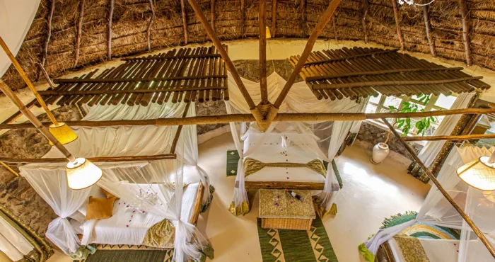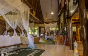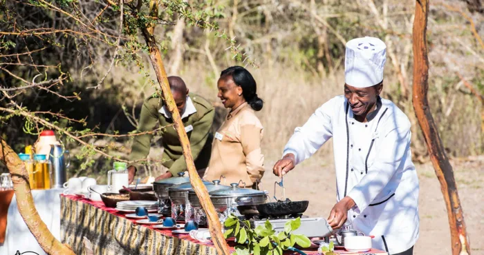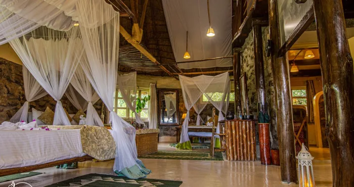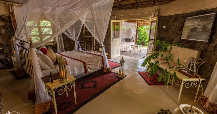 10 Rustic lava stone cottages with thatched roofs are surrounded by euphorbia candelabra, yellow-barked acacia, and indigenous trees. Only a few hours from Nairobi, being situated outside a National park allows many activities, including walking, mountain biking, and night game drives.