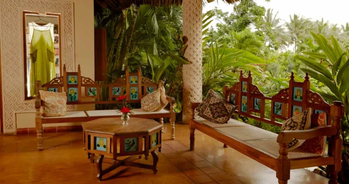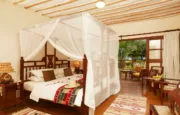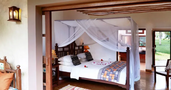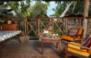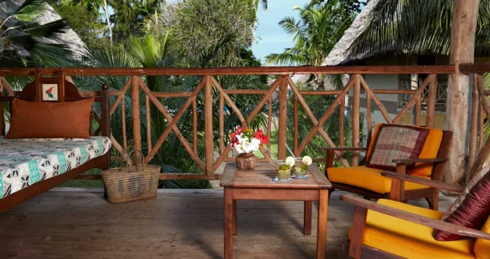 Guests choose from three types of deluxe rooms: Garden, Sea Side, and Ocean Front. Each room is 34m² and designed for relaxation, featuring a king-size bed, air conditioning, a mosquito net, and a large bathroom with a walk in rain shower. Every room includes satellite TV, a mini fridge, a safe, and a coffee/tea maker. Outside, guests can unwind on a private terrace with a Lamu daybed.