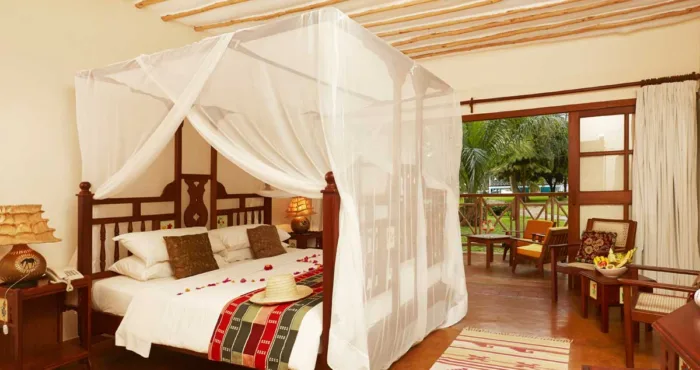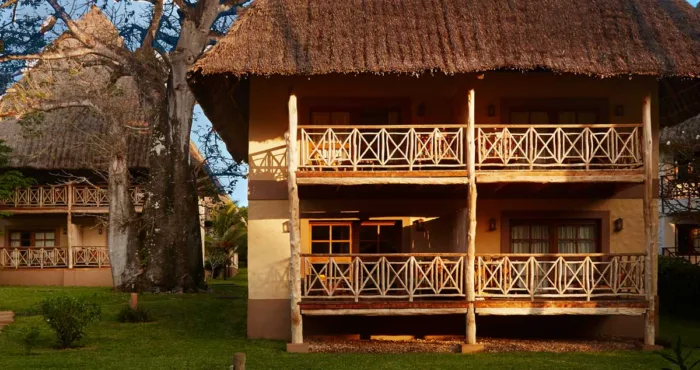 Neptune Palm Beach Boutique Resort & Spa sits along the white sands of Diani Beach on Kenya’s South Coast. This 4.5-star resort features Swahili-style architecture and lush tropical gardens that create a peaceful, intimate atmosphere. The resort has 60 spacious rooms set in makuti roofed cottages, with just four rooms per unit to ensure privacy and comfort.